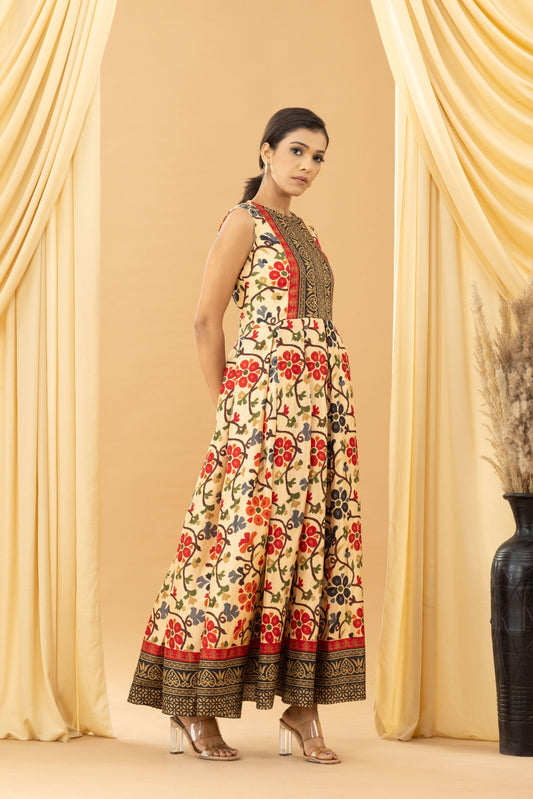 Aseel Beige Kalamkari Silk Back-less Pleated Dress