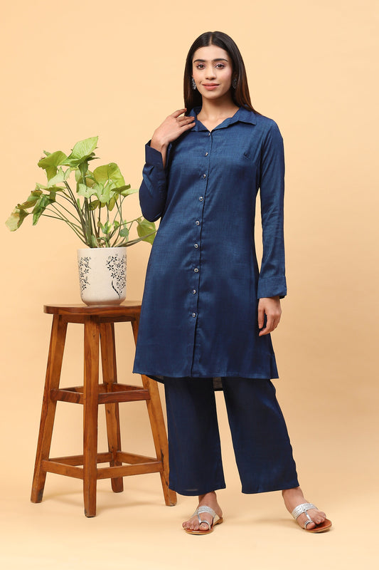 Harsingaar Prussian Blue Collared Kurta Palazzo Set