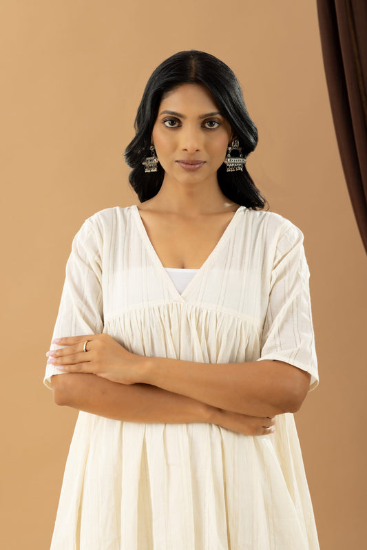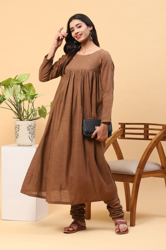 Sanchi Khaki Gathered Long Kurta Churidar Set