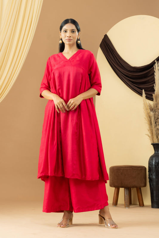 Harsingaar Candy Red Silk Gathered Kurta Set