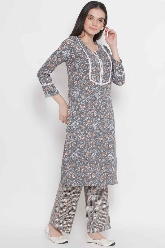 Riwaaz Floral Grey Kurta Set with Lace
