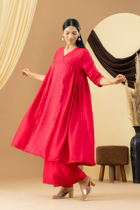 Harsingaar Candy Red Silk Gathered Suit Set