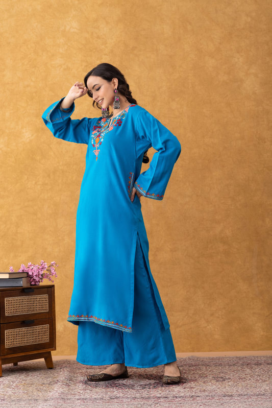 Utsaah Teal With Red Aari Embroidery Kurta Set