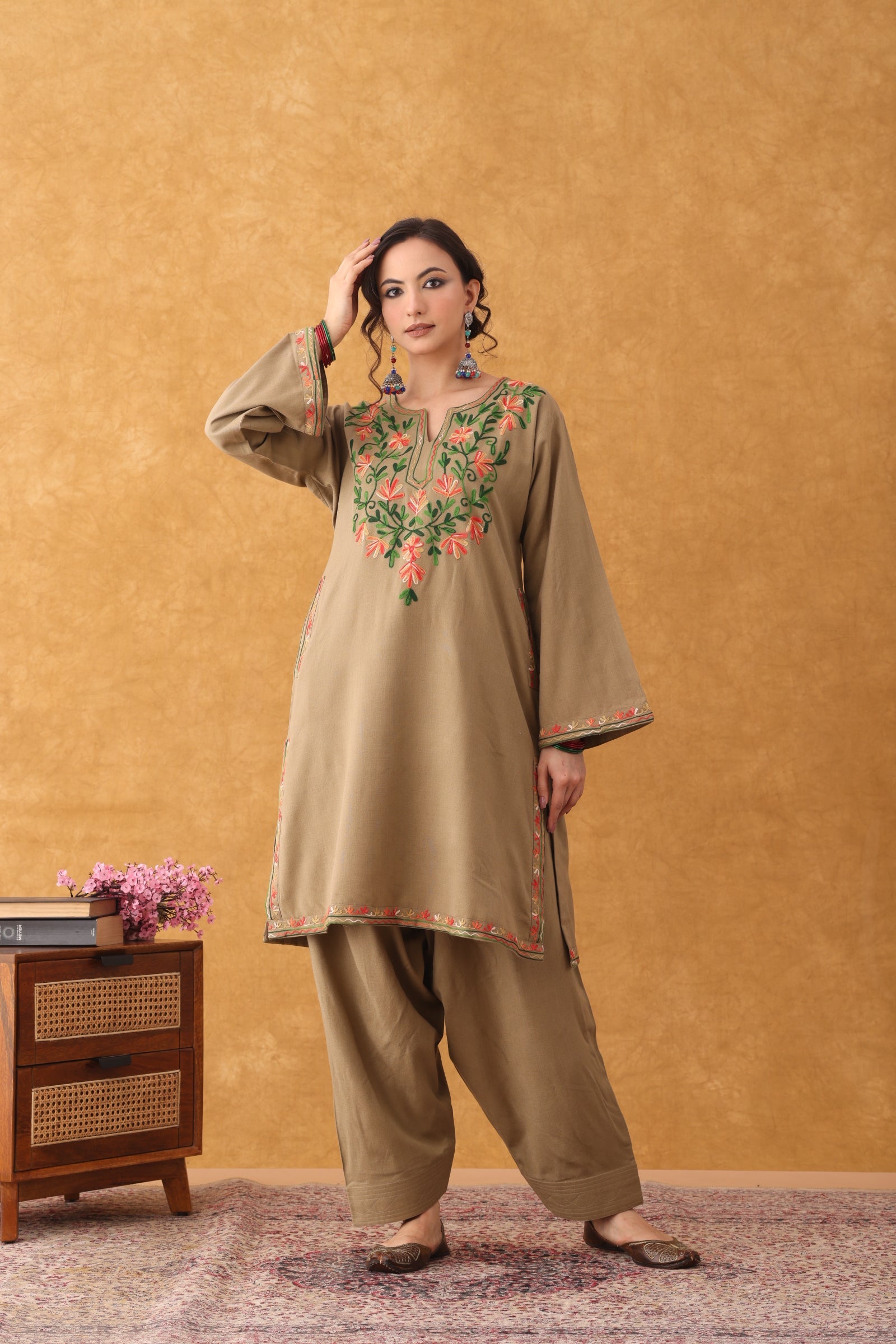 Embrace the elegance of Kashmiri artistry with our Noor Olive Green Multi Aari Embroidered Phiran Salwar Set, designed for timeless comfort and effortless winter style. The warm olive green shade serves as a perfect canvas for the vibrant multi-colored Aari embroidery, featuring intricate floral motifs in shades of coral, green, and pink. This handcrafted detailing adds depth, charm, and a touch of cultural richness to the ensemble.