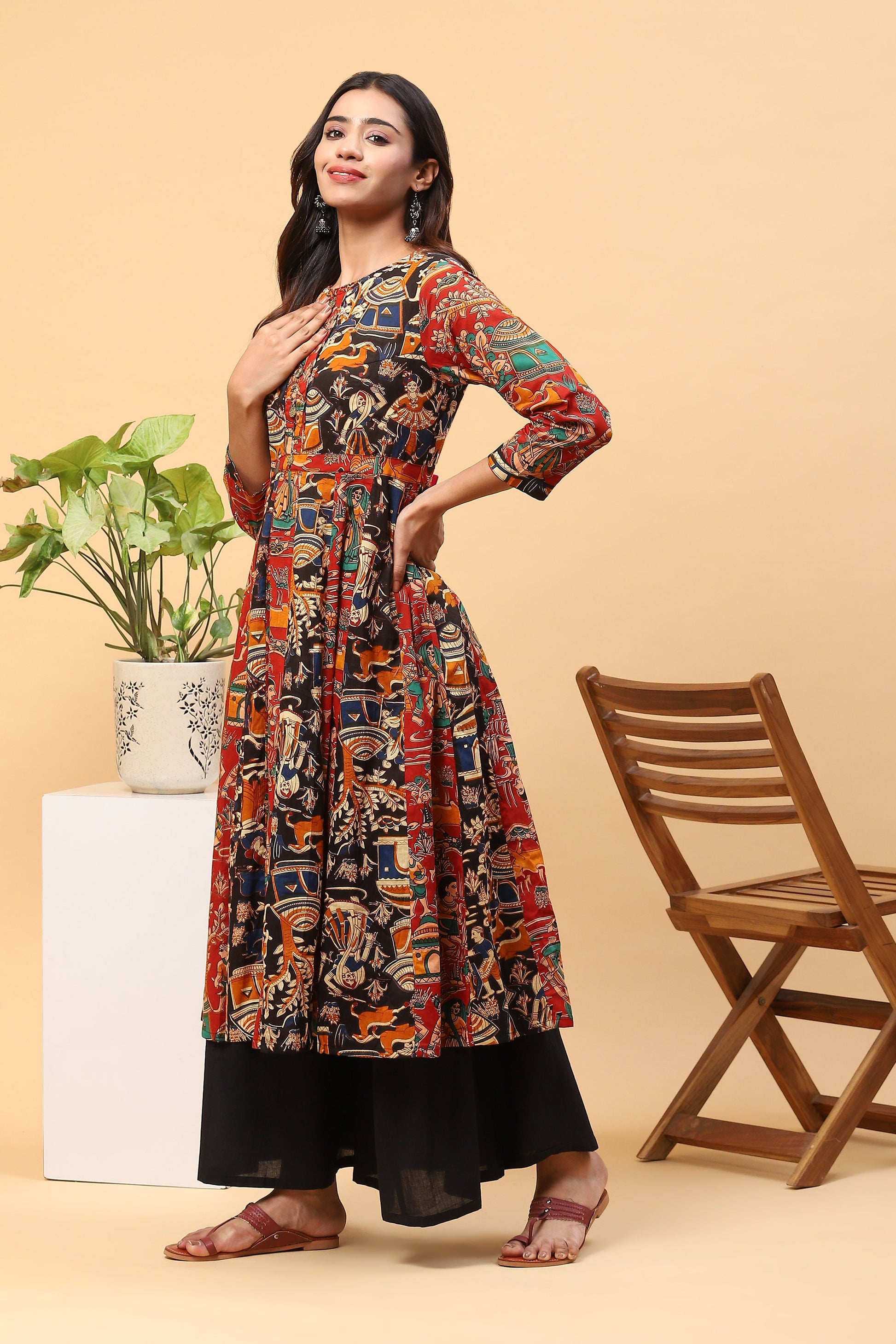 Red and Black Kalamkari Kurta gathered Kurta in Pure Cotton fabric with pleated waistline is extremely flattering on all body types. It comes with round neck, three fourth sleeves and a flared calf-length hem. Paired with flowy wide-legged palazzos, its the outfit ideal for office-wear and special events.